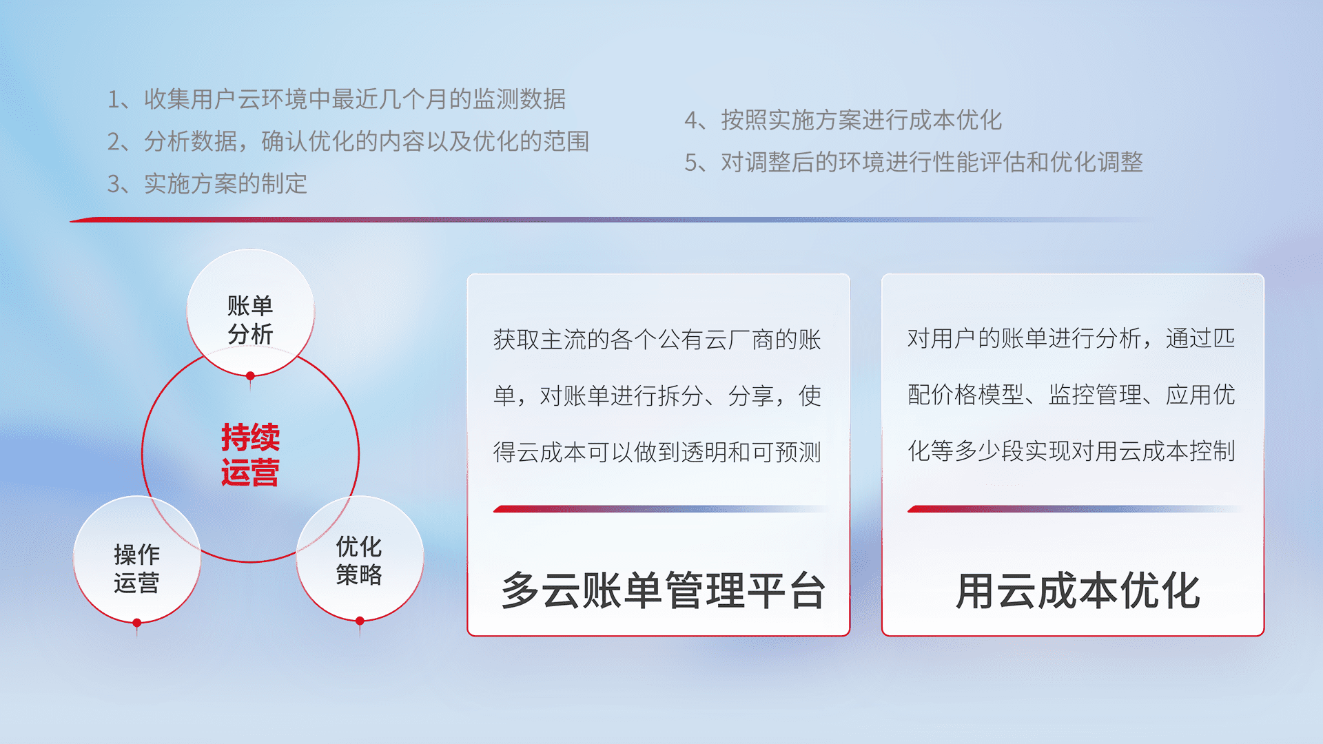 通过多云纳管,,,,以统一的资源数据模型把客户的云资源进行抽象和封装,,,进而实现对多云资源的统一操作,,,保障云资源管理的可靠性、、、稳定性与可用性。。量身定制化运维内容,,,配置、、、开发运维、、补丁管理、、、、备份、、、监控、、、、认证和访问管理、、、、审计和日常巡检等,,保障在用云过程中的可靠度,,,,稳定度以及高可用率。。